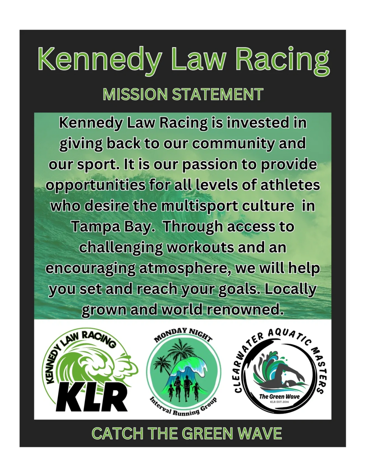 Kennedy Law Racing (KLR) based in the Tampa Bay Area is comprised of intensely competitive, hard charging triathletes, runners, cyclists and swimmers that not only train and race hard but utilize the same drive and determination to give back, to improve safety for all endurance athletes and our great community.